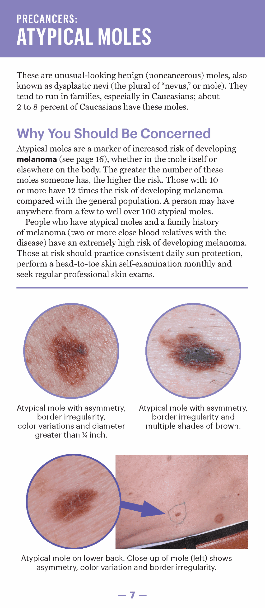 - Precancerous actinic keratoses and atypical moles, which can develop into skin cancers or increase your risk of developing skin cancers.