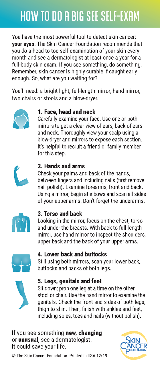 The Big See: Early Detection Starts with You! Skin cancer is the cancer you can see. Yet it often goes undetected until it’s disfiguring and difficult to treat — or even life-threatening. The Skin Cancer Foundation’s Big See campaign shows you how easy it is to open your eyes, get to know your skin, look in the mirror and ask, “What’s that?” Then keep these three words in mind: new, changing or unusual. It could save your life! The back of the card shows, step by step, how to do a Big See skin self-exam every month. If you see something, do something. See a dermatologist right away. Skin cancer is highly curable if caught early enough. So, what are you waiting for?